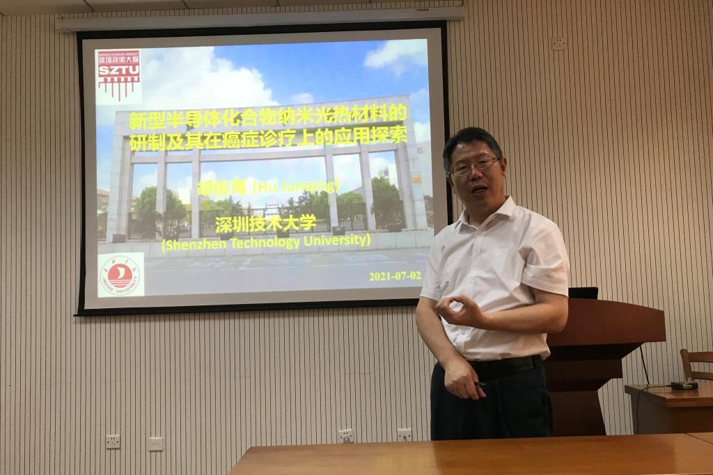 7月2日上午,应博彩app-亚洲博彩app 邀请,深圳技术大学健康与环境工程学院院长胡俊青一行来访,并作题为“新型半导体化合物纳米光热材料的研制及其在癌症诊疗上的应用探索”的学术报告,学院刘小明教授主持讲座,全院师生30余人到场聆听。