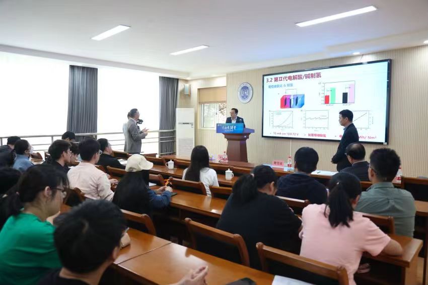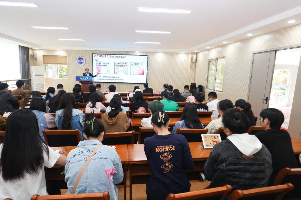 温珍海研究员首先阐释了电化学能源体系中的2个关键科学问题:即电能与化学能相互转换过程中存在的阴/阳极电化学热力学性质与动力学速率不协同问题、阴/阳极还原氧化反应各自适宜介质差异问题。围绕以上问题,温珍海研究员着重介绍了其领衔的课题组近期做的三方面工作:一是通过构建不同的电化学性质离子为阴、阳极载流子的混合电化学能源体系,协调阴/阳极电化学反应的媒介环境,提升活性物质分子电极反应的热力学活性和动力学速率,从而显著提高了相关电化学能源器件的性能;二是通过设计构建阴/阳极之间具有pH梯度的混合电化学合成体系,既优化了阴/阳极反应的介质环境,又能通过利用电化学中和降低电化学合成过程中的电耗;三是开发了以不同离子为载流子的水系电池和有机电解液电池,突破了传统电池电化学工作电压窗口限制瓶颈,显著提高了电池的工作电压和功率密度。报告结束后,在场师生踊跃提问,温珍海研究员耐心地解答了师生们提出的问题,现场气氛热烈。