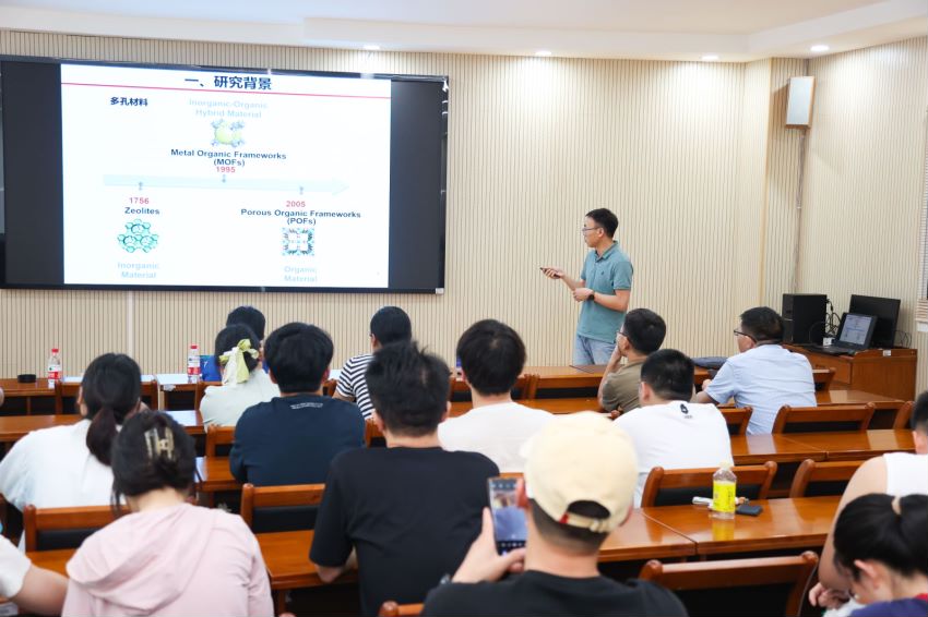 江令昌博士作题为《构筑特异功能多孔材料强化目标分子选择性捕获》的报告。报告提出,工业上气体分子捕获与分离过程耗能巨大,而筛选高效的固体吸附剂选择性捕获目标分子至关重要。基于此,报告人开展了利用功能高比面积有机多孔材料分离纯化乙烯与选择性捕获二氧化碳等方面的研究,通过系统研究材料结构与性能之间的关系,为设计高性能的吸附剂选择性捕获目标分子提供重要参考。