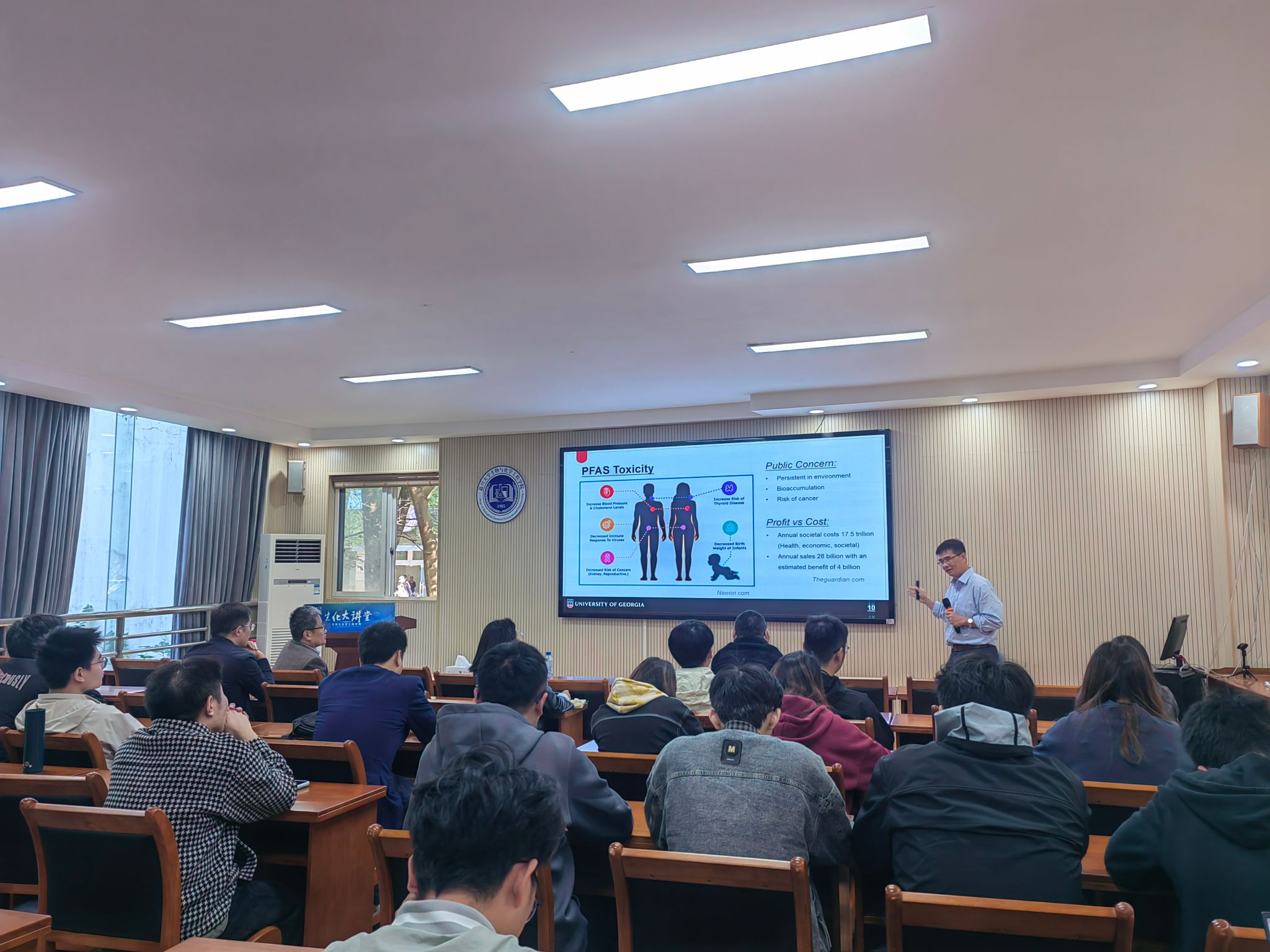 11月6日上午,美国佐治亚大学黄庆国教授作客“生化大讲堂”并应邀为博彩app 师生做题为《“永生分子”PFAS:挑战、法规和机遇》的学术报告。博彩app 胡长伟教授主持会议,全院师生近50人到场聆听。