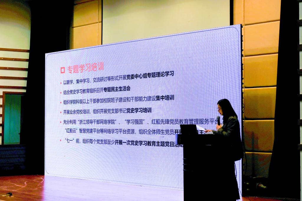 随后,杨丽娜对学院全体师生党员进行党史学习教育动员,并为大家上了一堂题为《奋斗百年路 启航新征程》的主题党课。她从“为什么学党史”、“党史学什么”、“党史怎么学”三个层面进行详细说明,为大家解疑答惑,进一步提高了全体党员的思想认识和党性修养。她要求全体师生党员牢记习近平总书记提出的“学党史、悟思想、办实事、开新局”“学史明理、学史增信、学史崇德、学史力行”目标要求,积极参与各种庆祝活动,展现红船学子蓬勃精神风貌,认真开展党史学习教育,筑牢理想信念之基,努力做到知行合一,全力支持嘉兴大学创建,以优异成绩向建党百年献礼。