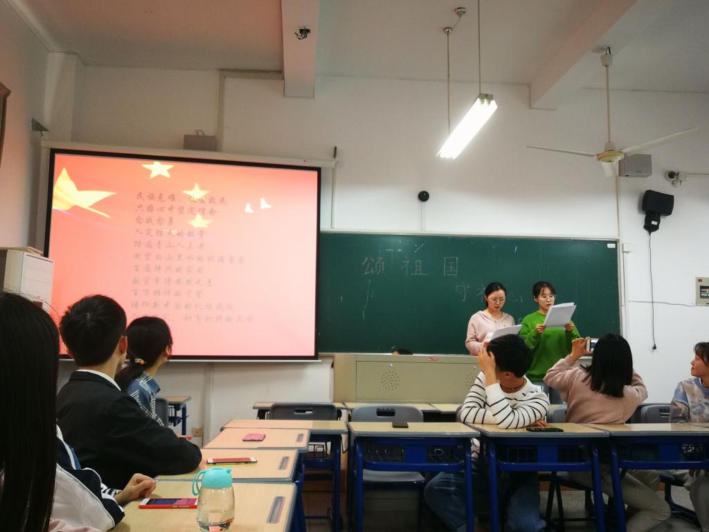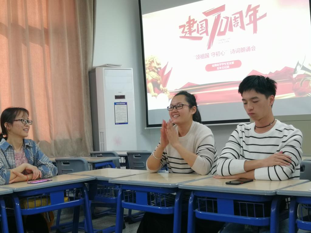 活动由学生党员代表柳依楠主持。首先是支部党员代表“颂祖国”的环节,“尽管多少次感到失意彷徨,但你总还是踏归途,重返家园,重返美丽,富饶,像采石场上的春天一样贫穷的祖国!”同学们深情朗读,言语中充满了对祖国发展的自豪。新四军历史研究会的文爷爷进行点评,并带领同学们回忆中国曾遭受的苦难,发展过程中的挫折等。最后,同学们向文爷爷请教生活或学习中遇到的问题,文爷爷以个人丰富的人生阅历,以身为老党员的所感所悟耐心解答。