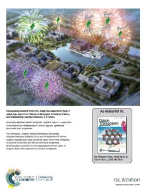 研究成果的论文题目为:Isopolymolybdate-based inorganic-organic hybrid compounds constructed by multidentate N-donor ligands: syntheses, structures and properties, 以封底论文形式发表于RSC期刊Dalton Transactions 2019, 48, 5541-5550。