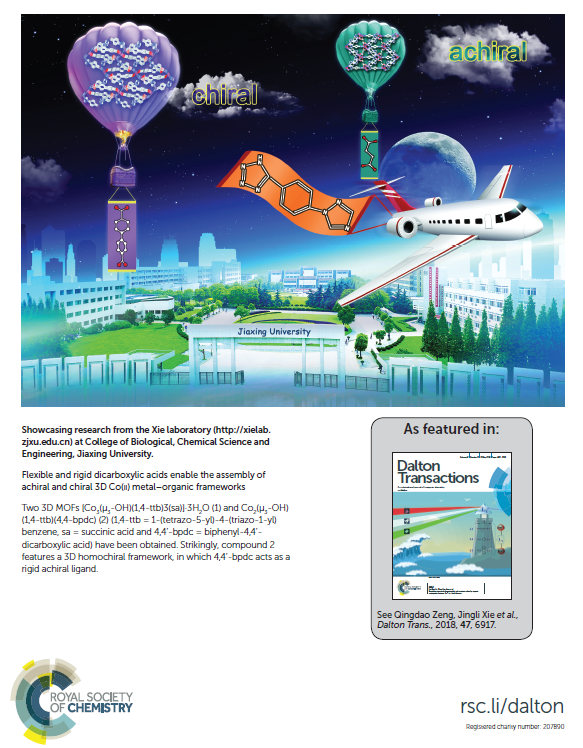博彩app 谢景力课题组(//xielab.bocaiappbet.com)巧妙地运用刚性有机配体4, 4’-联吡啶存在一定的扭自由度,成功合成均一手性金属有机框架化合物。论文题目为:Flexible and rigid dicarboxylic acids enable the assembly of achiral and chiral 3D Co(II) metal-organic frameworks, 该研究进展得到审稿人及编辑的积极评价, 以封底论文的形式发表于RSC期刊Dalton Transactions (2018, 47, 6917-6923), 第一作者为课题组成员宫春华(现为郑州大学博士研究生)