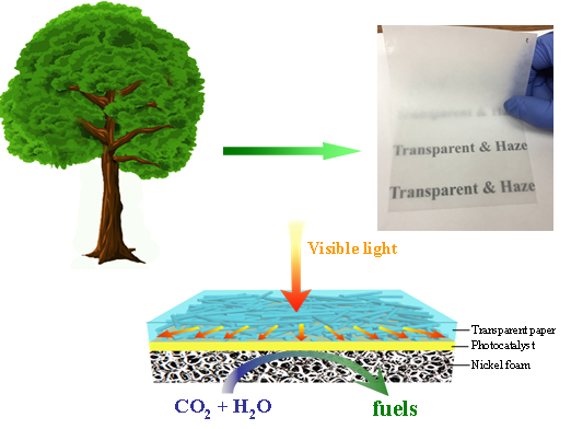 CO2是主要温室气体,利用半导体光催化还原技术在太阳光作用下将CO2催化转化成为CO、CH4、CH3OH等高附加值化学品,被认为是控制CO2排放最具前景的绿色技术。然而大部分半导体光催化剂对可见光的吸收和利用率非常低,极大地限制了CO2在太阳光下的光催化转化效率。围绕上述科学难题,研究组基于木材纤维设计和制备了具有高透明、高散射性能的透明纸,将其用于半导体光催化剂活性层表面作为光管理材料,可有效增加光催化剂对可见光的吸收和利用,从而实现光催化CO2转化效率的大幅度提升。此外研究还发现使用这种具有光管理功能的透明纸可以减少CO2光催化体系对入射光线角度的依赖。