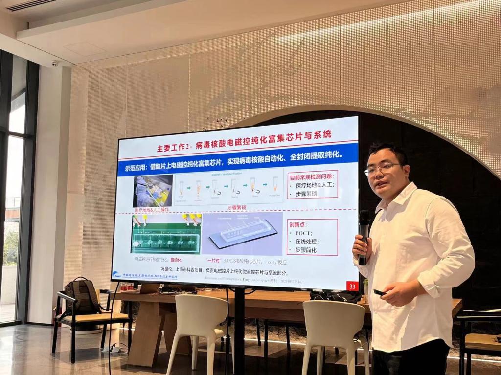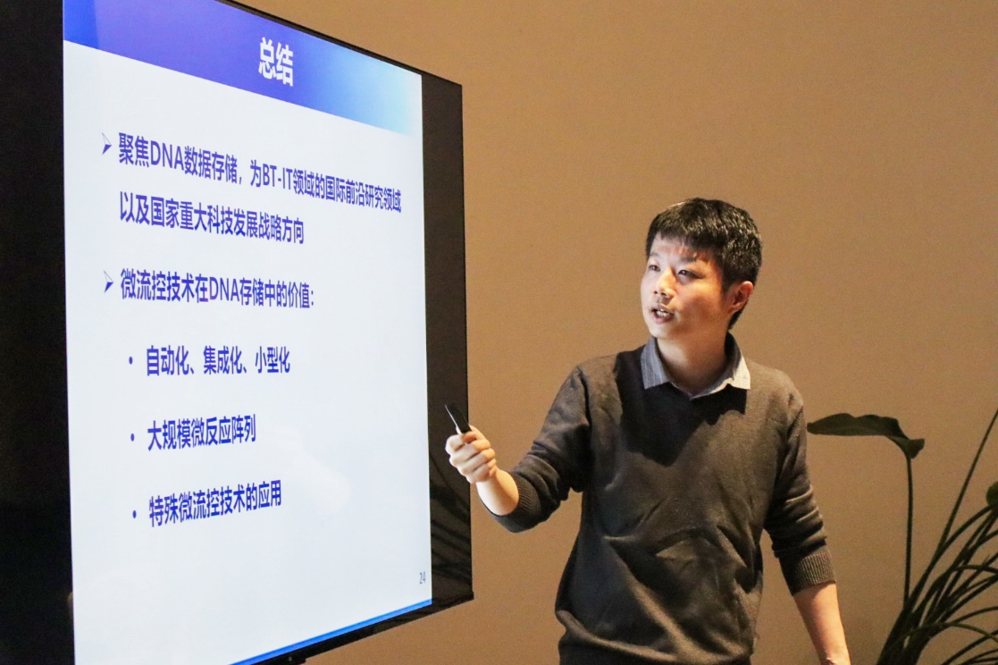 冯世伦研究员分享了《应用于病原体即时现场检测(POCT)的生物微流控芯片及其系统研制》的最新研究成果,详细阐述了生物微流控芯片在病原体现场检测(POCT)中的应用,就生物微流控芯片的运用机理以及应用前景与现场老师、同学进行了深入分享;罗源研究员则分享了其关于微流控技术在DNA数据存储中的应用的最新研究进展,详细介绍了微流控技术如何在DNA数据存储中发挥作用以及作用原理、面临的难点等,为下一步的研究方向提供了指引。
