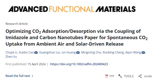 相关研究以“Optimizing CO2 Adsorption/Desorption via the Coupling of Imidazole and Carbon Nanotubes Paper for Spontaneous CO2 Uptake from Ambient Air and Solar-Driven Release”为题于2024年4月15日发表于材料科学顶级期刊《Advanced Functional Materials》(影响因子19.0),嘉兴大学为第一单位,该研究得到了国家自然科学基金项目(22275074和22102063)的资助。