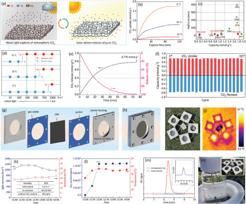 实验证实该CBP在不同的温度下展现出了优异的CO2吸附容量和动力学特性,表明CBP在寒冷、温暖或炎热的气候下都具有潜在的DAC应用价值。此外,CBP在太阳能驱动CO2释放方面也展现了巨大优势。在模拟阳光照射下,CBP能够在短时间内实现100%的CO2释放。该研究还展示了该CBP在大规模生产和成本效益方面的潜力。作为太阳能再生DAC系统的核心组件,EMI/CNTs纸可以批量生产,并具有良好的成本效益。