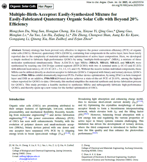 周二军团队在有机太阳能电池方向取得重要研究进展。相关研究成果以“Multiple-Birth-Acceptor : Easily-Synthesized Mixture for Easily-Fabricated Quaternary Organic Solar Cells with Beyond 20% Efficiency”为题,在化学类顶级期刊《Angew. Chem. Int. Ed.》上发表。这是博彩app