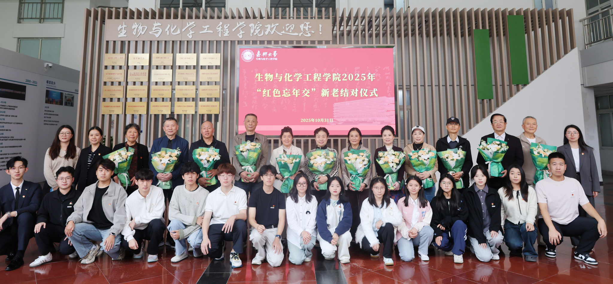 2025年“红色忘年交”新老结对仪式在仁济楼隆重举行。嘉兴市新四军历史研究会十余位老同志、老党员,学院党委书记任玉萍、党委副书记黄艺,学工办全体辅导员及2025级60余名学生代表齐聚一堂,共同见证这场跨越代际的红色传承仪式。仪式由学院党委副书记黄艺主持。